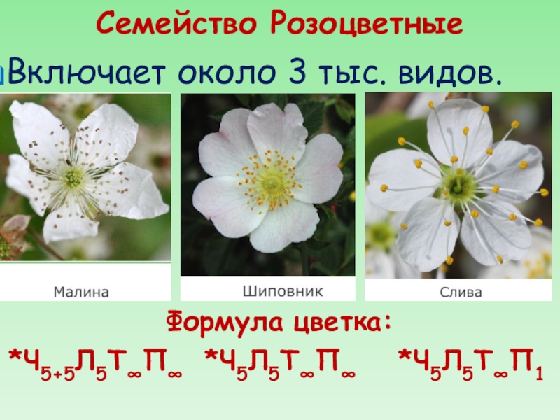 Семейство РозоцветныеВключает около 3 тыс. видов.*Ч5Л5Т∞П1Формула цветка: *Ч5Л5Т∞П∞ *Ч5+5Л5Т∞П∞