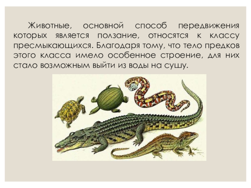Животные, основной способ передвижения которых является ползание, относятся к классу пресмыкающихся. Благодаря тому, что тело предков этого класса имело особенное строение, для них стало возможным выйти из воды на сушу.