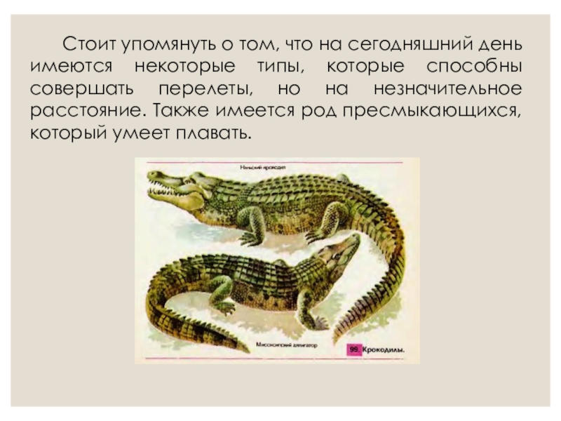 которые способны совершать перелеты, но на незначительное расстояние. Также имеется род пресмыкающихся, который умеет плавать.
