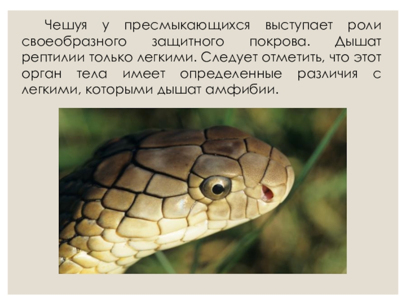 Слайд 5Чешуя у пресмыкающихся выступает роли своеобразного защитного покрова. Дышат рептилии только