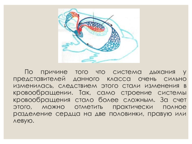 сильно изменилась, следствием этого стали изменения в кровообращении. Так, само строение системы кровообращения стало более сложным. За счет этого, можно отметить практически полное разделение сердца на две половинки, правую или левую.