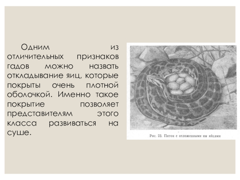 Слайд 4Одним из отличительных признаков гадов можно назвать откладывание яиц, которые покрыты