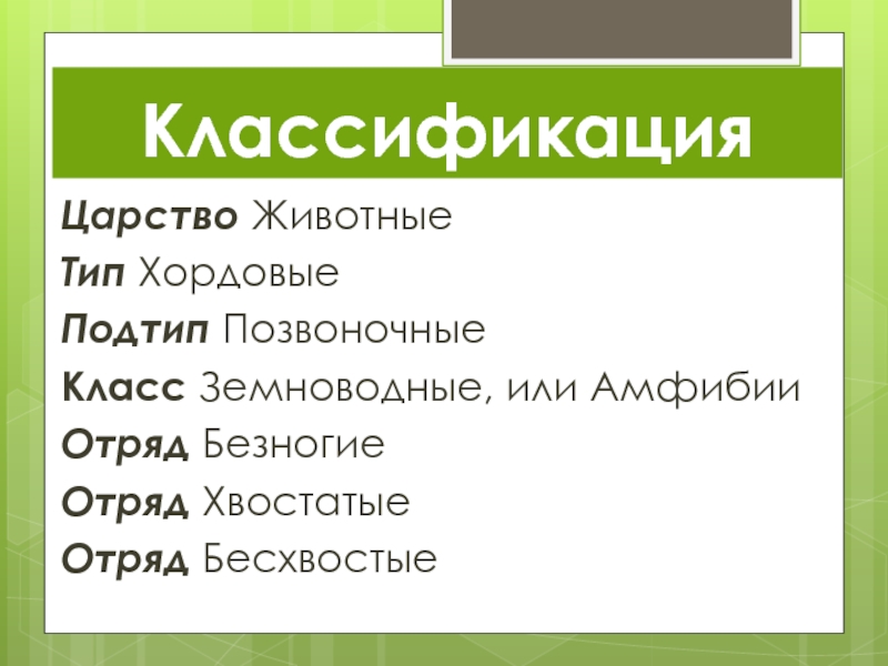 КлассификацияЦарство Животные Тип ХордовыеПодтип ПозвоночныеКласс Земноводные, или АмфибииОтряд БезногиеОтряд ХвостатыеОтряд Бесхвостые
