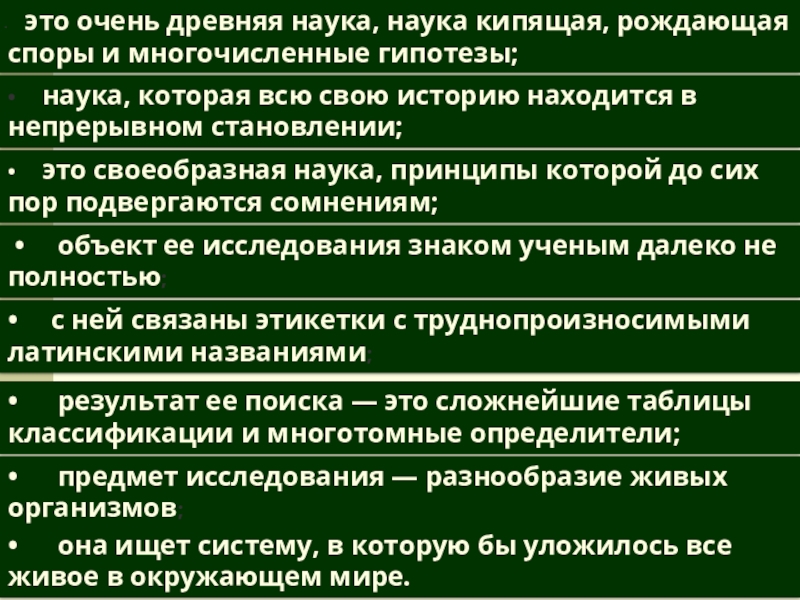 • она ищет систему, в которую бы уложилось все живое в окружающем мире.