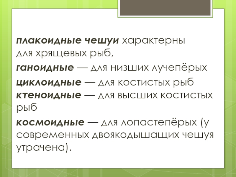 плакоидные чешуи характерны для хрящевых рыб, ганоидные — для низших лучепёрыхциклоидные — для костистых рыб ктеноидные — для высших костистых рыб космоидные —