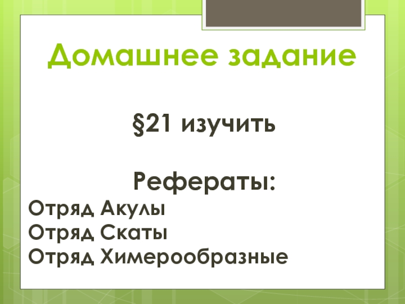 Домашнее задание§21 изучить Рефераты:Отряд АкулыОтряд СкатыОтряд Химерообразные