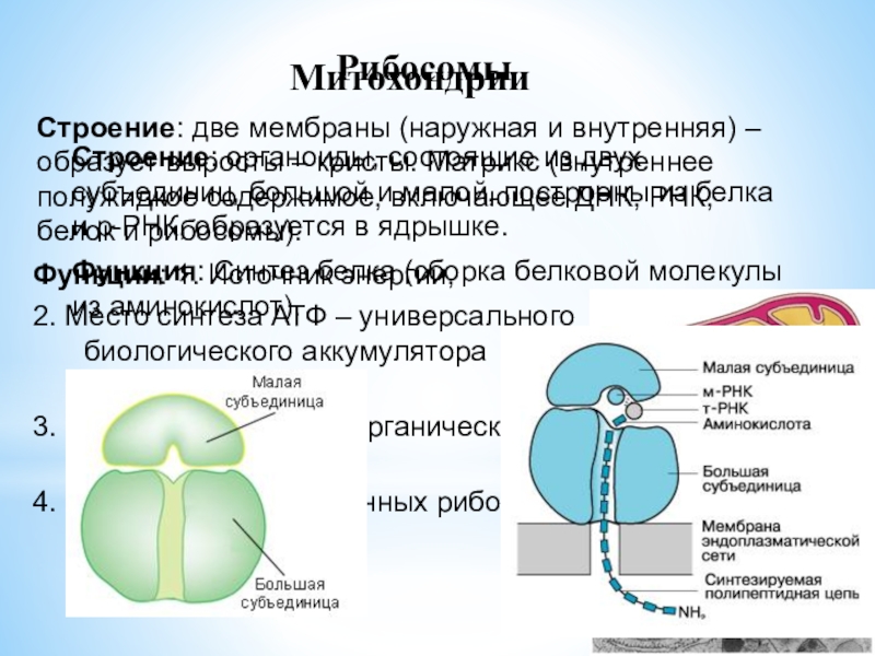 Строение: органоиды, состоящие из двух субъединиц, большой и малой, построены из белка и р-РНК, образуется в ядрышке.