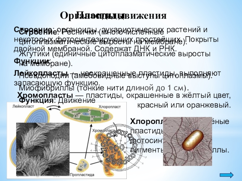 Хлоропласты — зелёные пластиды, несущие фотосинтезирующие пигменты — хлорофиллы.