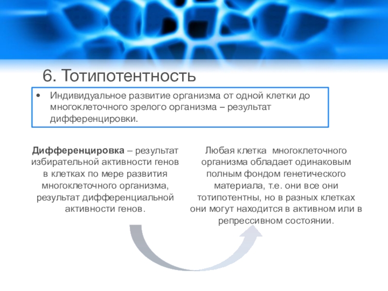 Любая клетка многоклеточного организма обладает одинаковым полным фондом генетического материала, т.е. они все они тотипотентны, но в разных клетках они могут находится в активном или в репрессивном состоянии.