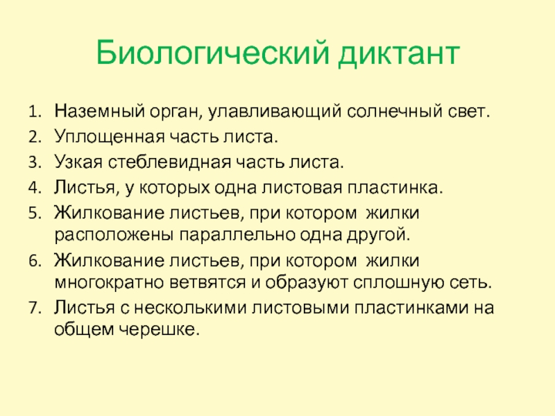 Биологический диктантНаземный орган, улавливающий солнечный свет.Уплощенная часть листа.Узкая стеблевидная часть листа.Листья, у которых одна листовая пластинка.Жилкование листьев, при котором жилки расположены параллельно одна другой.Жилкование листьев, при котором жилки многократно ветвятся и образуют сплошную сеть.Листья с несколькими