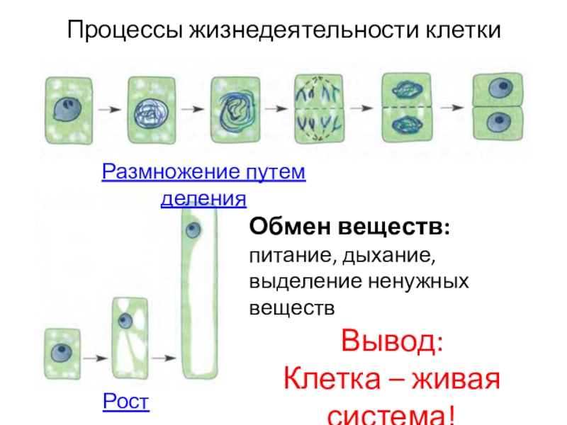 Процессы жизнедеятельности клеткиРазмножение путем деленияРостОбмен веществ: питание, дыхание, выделение ненужных веществВывод:Клетка – живая система!