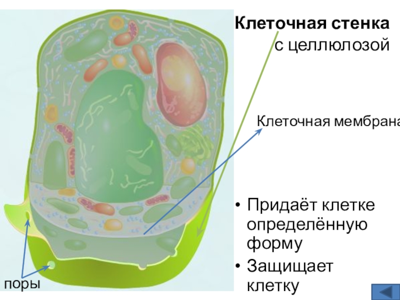 Клеточная стенка с целлюлозойПридаёт клетке определённую формуЗащищает клеткуКлеточная мембранапоры