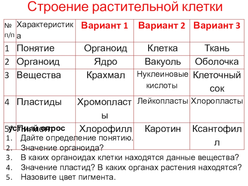Строение растительной клеткиустный опросДайте определение понятию.Значение органоида?В каких органоидах клетки находятся данные вещества?Значение пластид? В каких органах