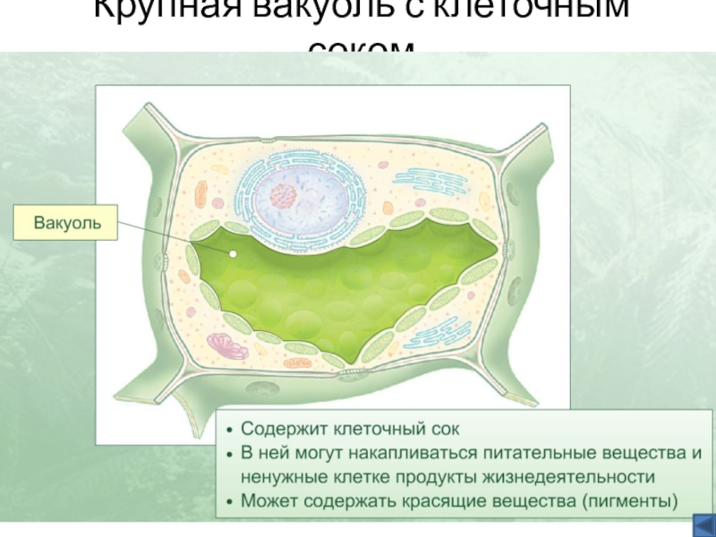 Слайд 13Крупная вакуоль с клеточным соком