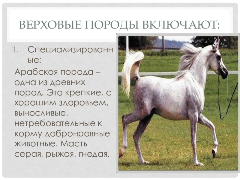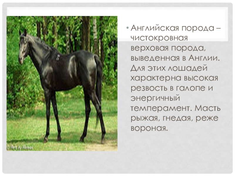 Слайд 8Английская порода – чистокровная верховая порода, выведенная в Англии. Для этих