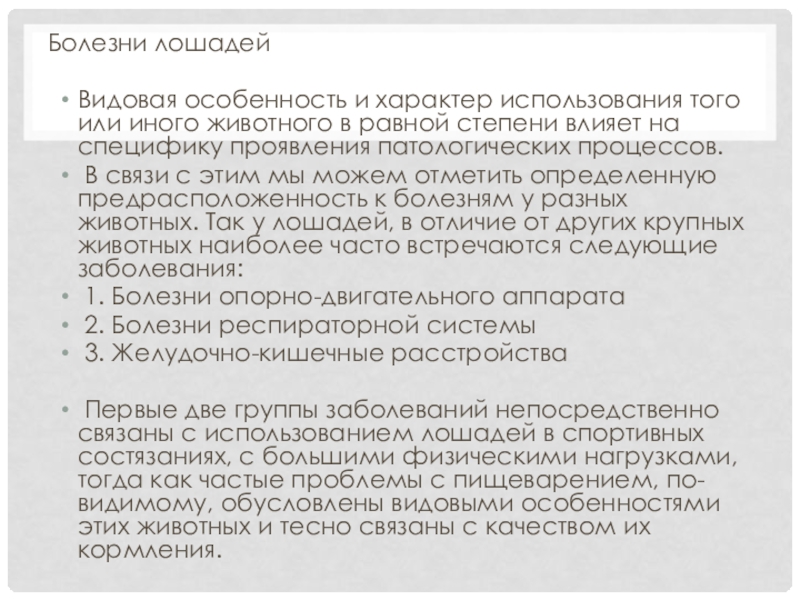 В связи с этим мы можем отметить определенную предрасположенность к болезням у разных животных. Так у лошадей, в отличие от других крупных животных наиболее часто встречаются следующие заболевания: