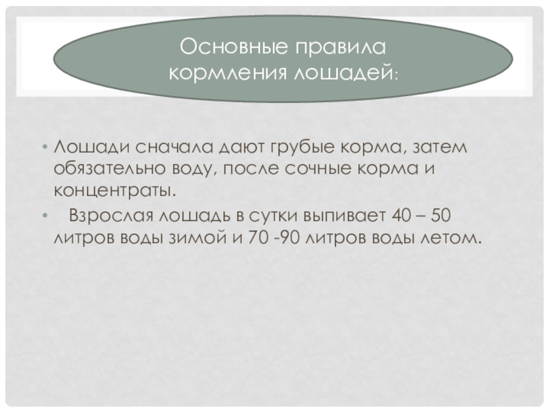 Слайд 16Лошади сначала дают грубые корма, затем обязательно воду, после сочные корма