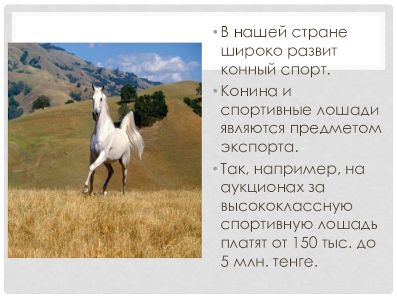 Так, например, на аукционах за высококлассную спортивную лошадь платят от 150 тыс. до 5 млн. тенге.