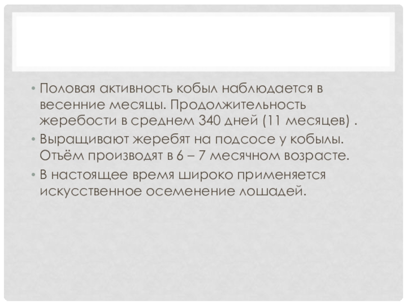 Слайд 14Половая активность кобыл наблюдается в весенние месяцы. Продолжительность жеребости в среднем