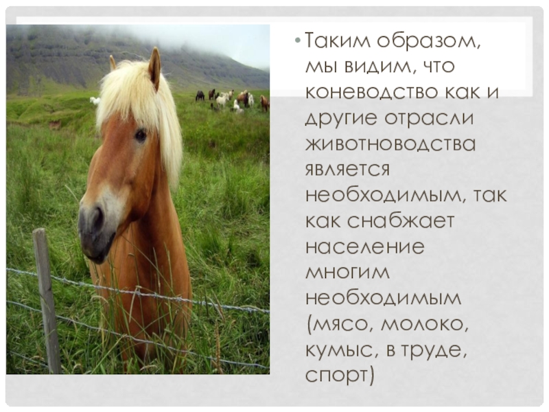 Слайд 18Таким образом, мы видим, что коневодство как и другие отрасли животноводства