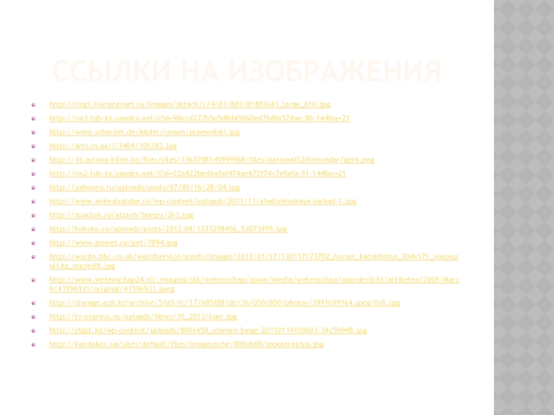 ССЫЛКИ НА ИЗОБРАЖЕНИЯhttp://img1.liveinternet.ru/images/attach/c/4/81/883/81883681_large_010.jpghttp://im3-tub-kz.yandex.net/i?id=90ccd277b5e548445060ed7b8fa57dae-80-144&n=21http://www.schäckel.de/bilder/rassen/przewalski.jpghttp://arts.in.ua/i/3404/105382.jpghttp://16.astana-bilim.kz/files/sites/1365748145999568/files/national%20sinvoldar/gerb.pnghttp://im2-tub-kz.yandex.net/i?id=22a422bedbafaf474aeb72f74c7e5afa-91-144&n=21http://yahooeu.ru/uploads/posts/07/05/16/28/04.jpghttp://www.animalsglobe.ru/wp-content/uploads/2011/11/ahaltekinskaya-loshad-1.jpghttp://zooclub.ru/attach/horses/263.jpghttp://kohuku.ru/uploads/posts/2012-04/1333298406_53073999.jpghttp://www.zoovet.ru/pet/7894.jpghttp://wscdn.bbc.co.uk/worldservice/assets/images/2013/01/17/130117173702_horses_kazakhstan_304x171_voxpopuli.kz_nocredit.jpghttp://www.wetenschap24.nl/.imaging/stk/wetenschap/zoom/media/wetenschap/noorderlicht/artikelen/2009/March/41596931/original/41596931.jpeghttp://storage.azh.kz/archive/51a5/fc/17/a85f88/de/36/050/000/photos/3991699164.jpeg/full.jpghttp://tv-express.ru/uploads/News/10_2013/koni.jpghttp://ztgzt.kz/wp-content/uploads/800x450_alaman-baige-20110114100603-34c5b948.jpghttp://kondakov.ua/sites/default/files/imagecache/800x600/ippoterapiya.jpg