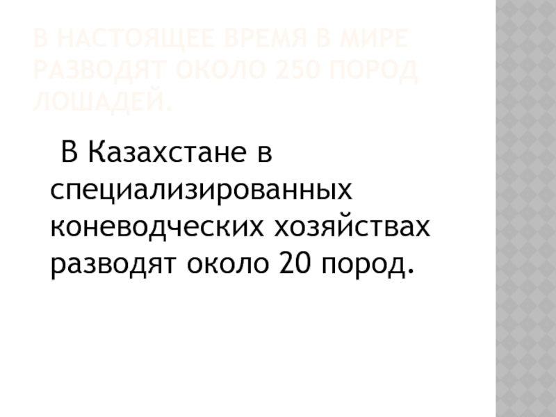 В НАСТОЯЩЕЕ ВРЕМЯ В МИРЕ РАЗВОДЯТ ОКОЛО 250 ПОРОД ЛОШАДЕЙ.	В Казахстане в специализированных коневодческих
