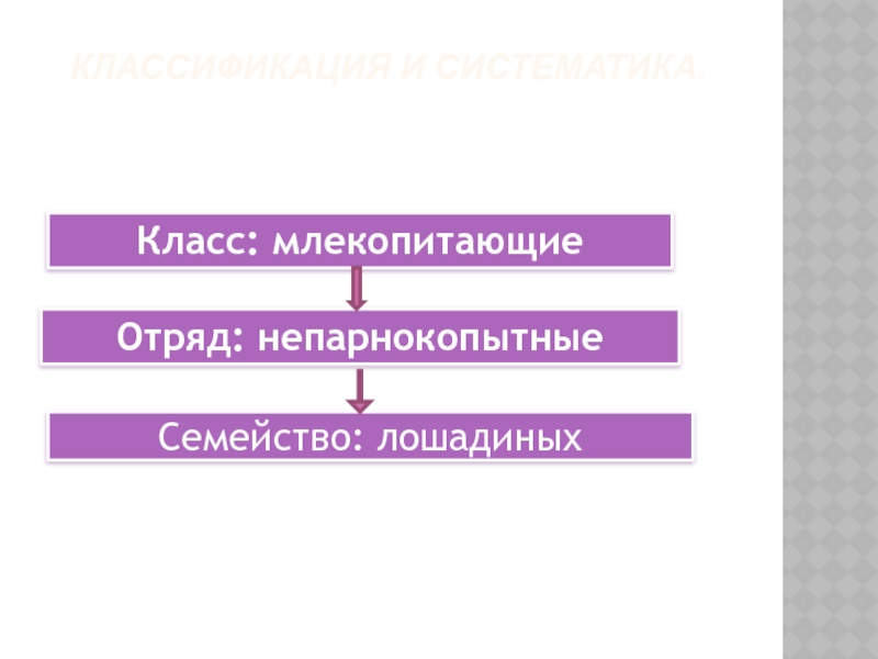КЛАССИФИКАЦИЯ И СИСТЕМАТИКА.Класс: млекопитающиеОтряд: непарнокопытныеСемейство: лошадиных