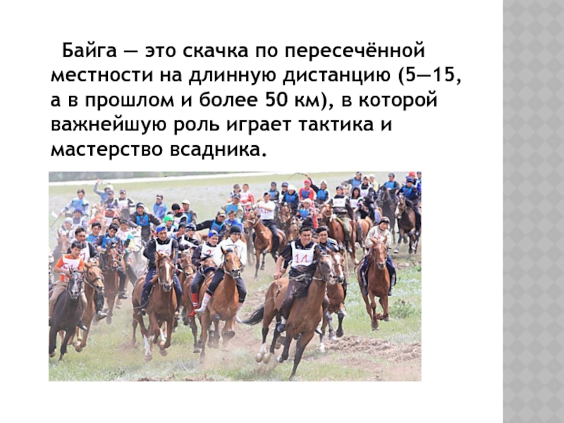 Слайд 30 Байга — это скачка по пересечённой местности на длинную дистанцию (5—15, а