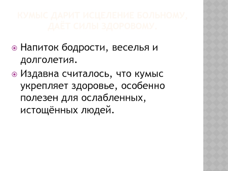 Слайд 26КУМЫС ДАРИТ ИСЦЕЛЕНИЕ БОЛЬНОМУ, ДАЁТ СИЛЫ ЗДОРОВОМУ.