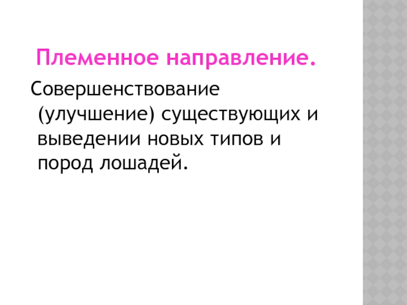 ОСНОВНЫЕ НАПРАВЛЕНИЯ КОНЕВОДСТВА.Племенное направление.	Совершенствование (улучшение) существующих и выведении новых типов и пород лошадей.