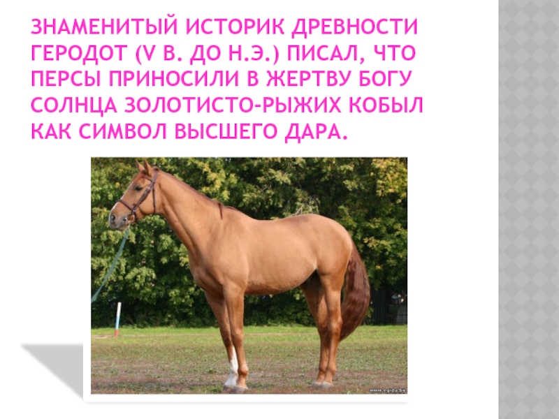 ЗНАМЕНИТЫЙ ИСТОРИК ДРЕВНОСТИ ГЕРОДОТ (V В. ДО Н.Э.) ПИСАЛ, ЧТО ПЕРСЫ ПРИНОСИЛИ В ЖЕРТВУ БОГУ СОЛНЦА ЗОЛОТИСТО-РЫЖИХ