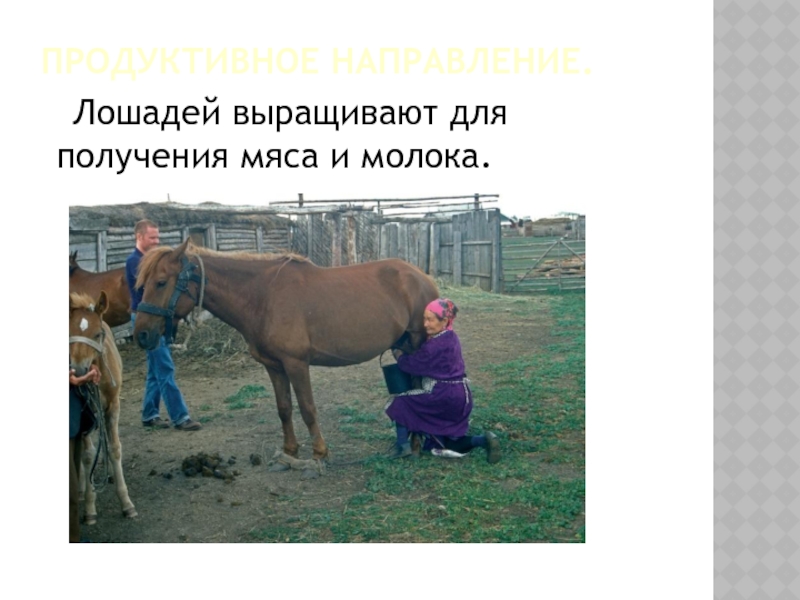 ПРОДУКТИВНОЕ НАПРАВЛЕНИЕ.		Лошадей выращивают для получения мяса и молока.