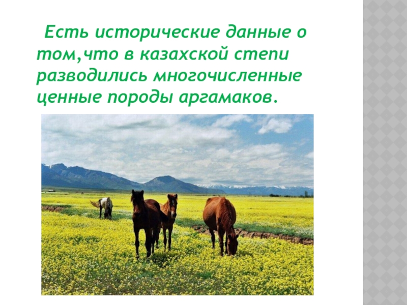Слайд 11 Есть исторические данные о том,что в казахской степи разводились многочисленные ценные