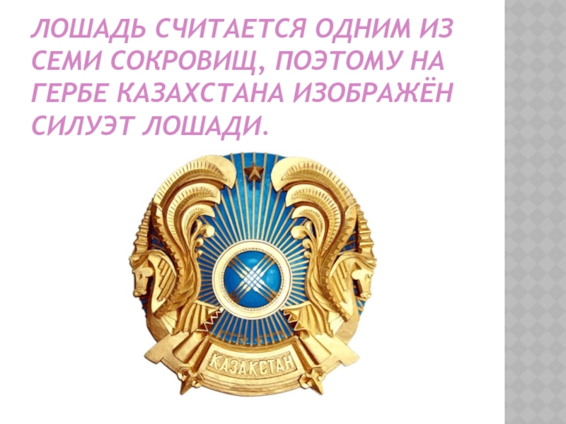 Слайд 7ЛОШАДЬ СЧИТАЕТСЯ ОДНИМ ИЗ СЕМИ СОКРОВИЩ, ПОЭТОМУ НА ГЕРБЕ КАЗАХСТАНА ИЗОБРАЖЁН