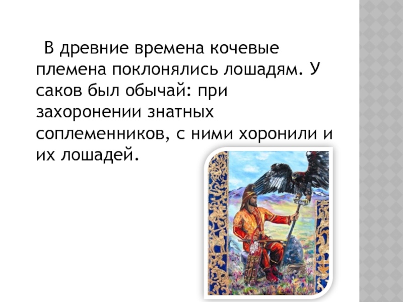 Слайд 5 В древние времена кочевые племена поклонялись лошадям. У саков был обычай: