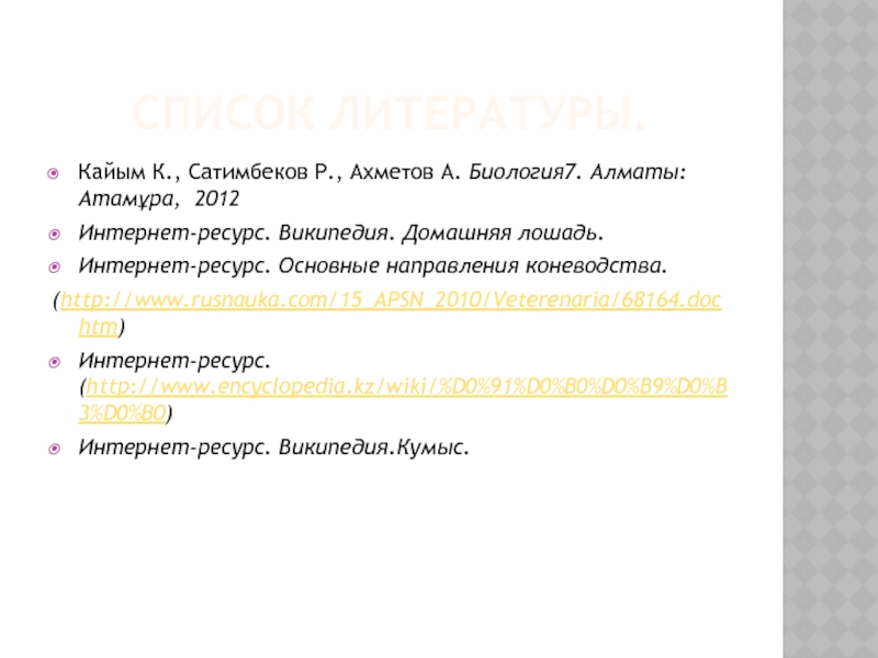 CПИСОК ЛИТЕРАТУРЫ.Кайым К., Сатимбеков Р., Ахметов А. Биология7. Алматы:Атамұра, 2012Интернет-ресурс. Википедия. Домашняя лошадь.Интернет-ресурс. Основные направления коневодства.(http://www.rusnauka.com/15_APSN_2010/Veterenaria/68164.dochtm)Интернет-ресурс. (http://www.encyclopedia.kz/wiki/%D0%91%D0%B0%D0%B9%D0%B3%D0%B0)Интернет-ресурс.