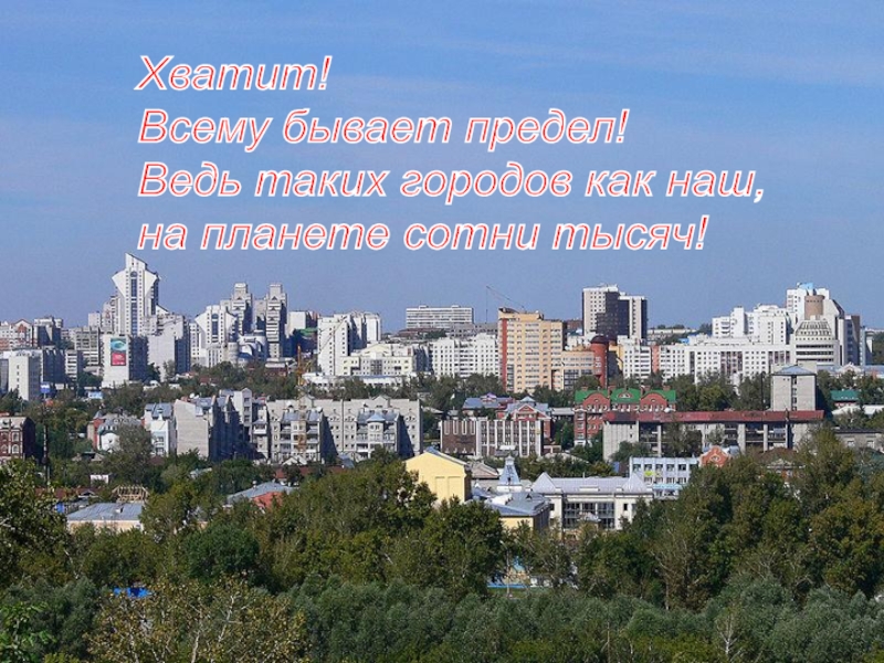 Хватит!  Всему бывает предел!  Ведь таких городов как наш,  на планете сотни тысяч!