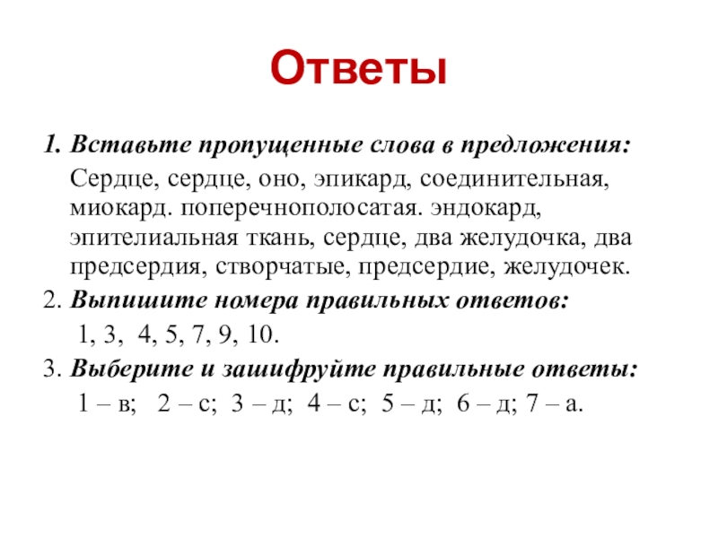 эпикард, соединительная, миокард. поперечнополосатая. эндокард, эпителиальная ткань, сердце, два желудочка, два предсердия, створчатые, предсердие, желудочек.