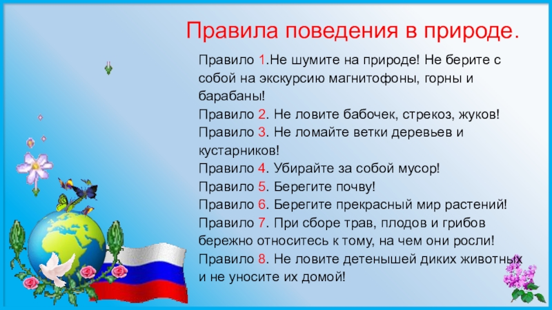 Если собирать букеты в лесу или на лугу, будет меньше шмелей и бабочек, которым нектар цветков нужен для питания. Не забывай и о том, что растения дают животным убежище. Оберегая травы, кусты и деревья, ты помогаешь зверям, птицам и насекомым, которые скрываются в их зарослях.