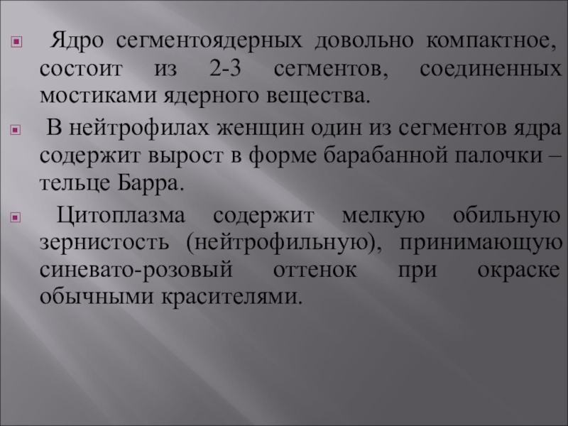 Слайд 14 Ядро сегментоядерных довольно компактное, состоит из 2-3 сегментов, соединенных мостиками