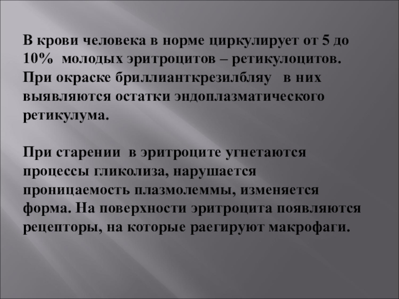 При старении в эритроците угнетаются процессы гликолиза, нарушается проницаемость плазмолеммы, изменяется форма. На поверхности эритроцита появляются рецепторы, на которые раегируют макрофаги.