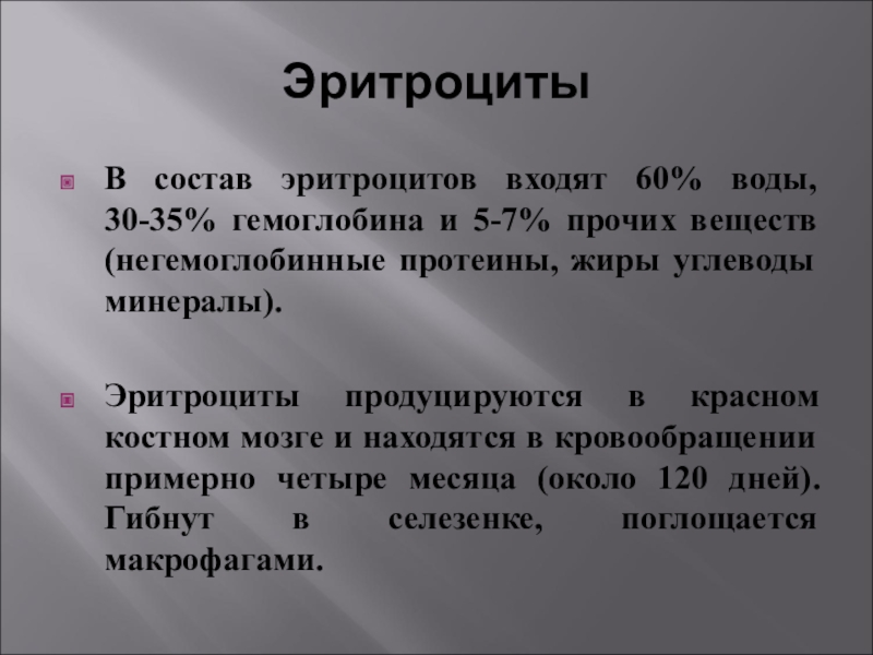 В состав эритроцитов входят 60% воды, 30-35% гемоглобина и 5-7%