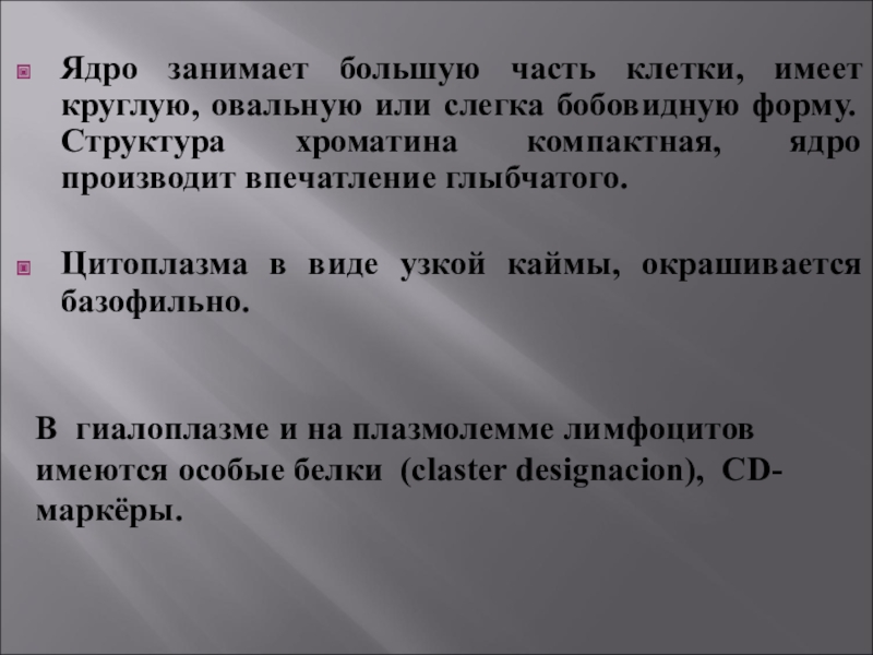 В гиалоплазме и на плазмолемме лимфоцитов имеются особые белки (claster designacion), CD-маркёры.