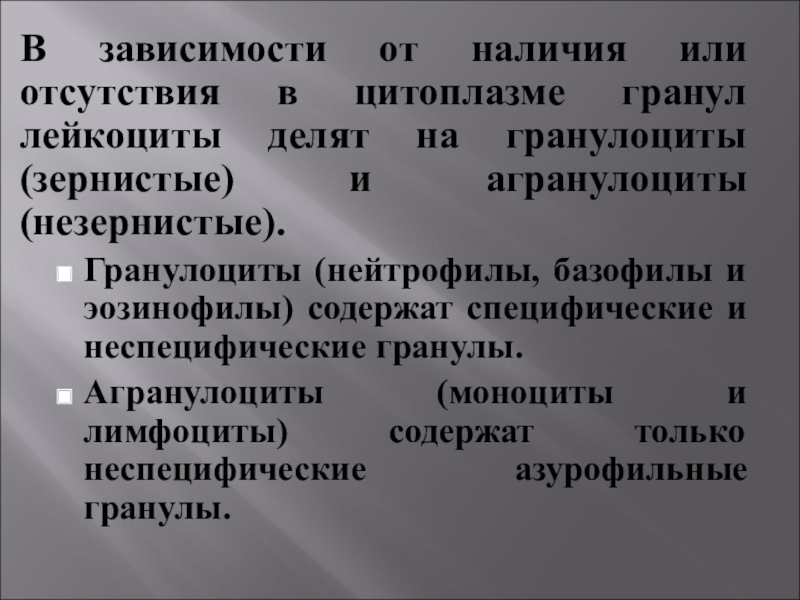 Слайд 11В зависимости от наличия или отсутствия в цитоплазме гранул лейкоциты делят