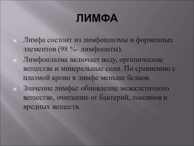 Лимфа состоит из лимфоплазмы и форменных элементов (98 %- лимфоциты).