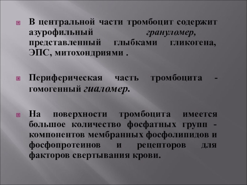 Слайд 37В центральной части тромбоцит содержит азурофильный грануломер, представленный глыбками гликогена, ЭПС,