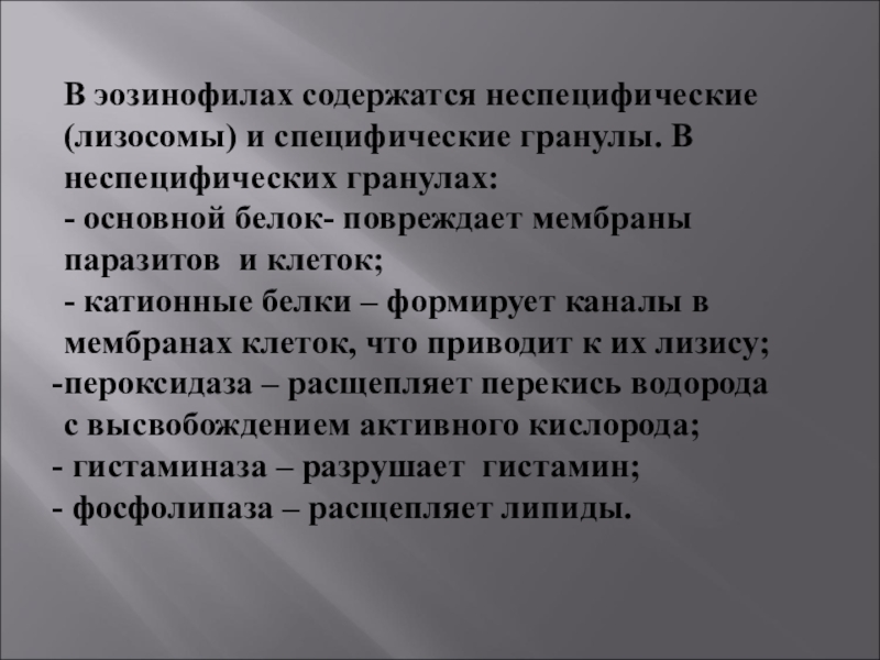 Слайд 18В эозинофилах содержатся неспецифические (лизосомы) и специфические гранулы. В неспецифических гранулах: