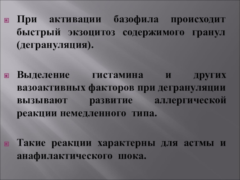 Слайд 26При активации базофила происходит быстрый экзоцитоз содержимого гранул (дегрануляция).