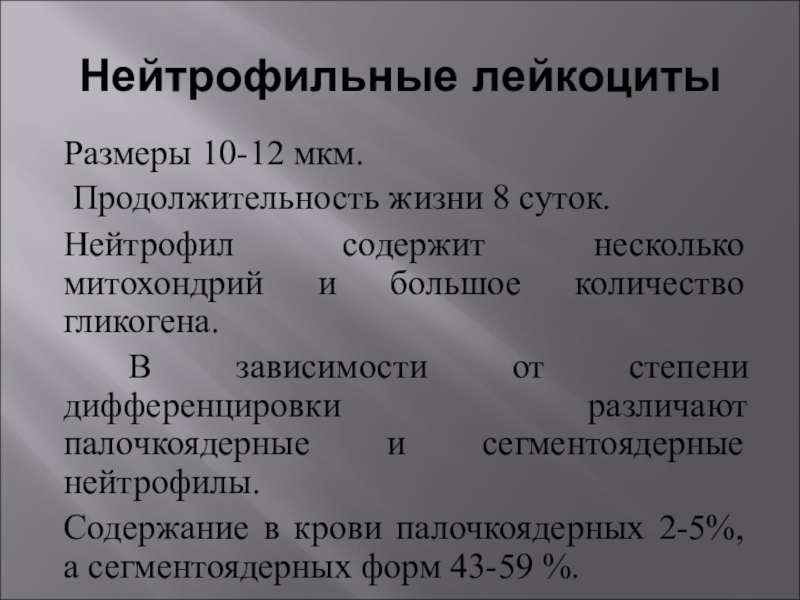 В зависимости от степени дифференцировки различают палочкоядерные и сегментоядерные нейтрофилы.