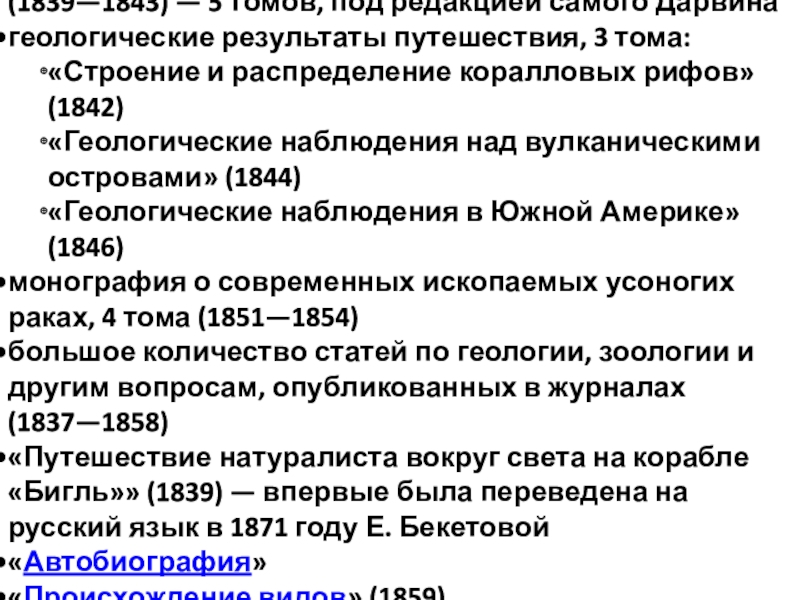 «Путешествие натуралиста вокруг света на корабле «Бигль»» (1839) — впервые была переведена на русский язык в 1871 году Е. Бекетовой